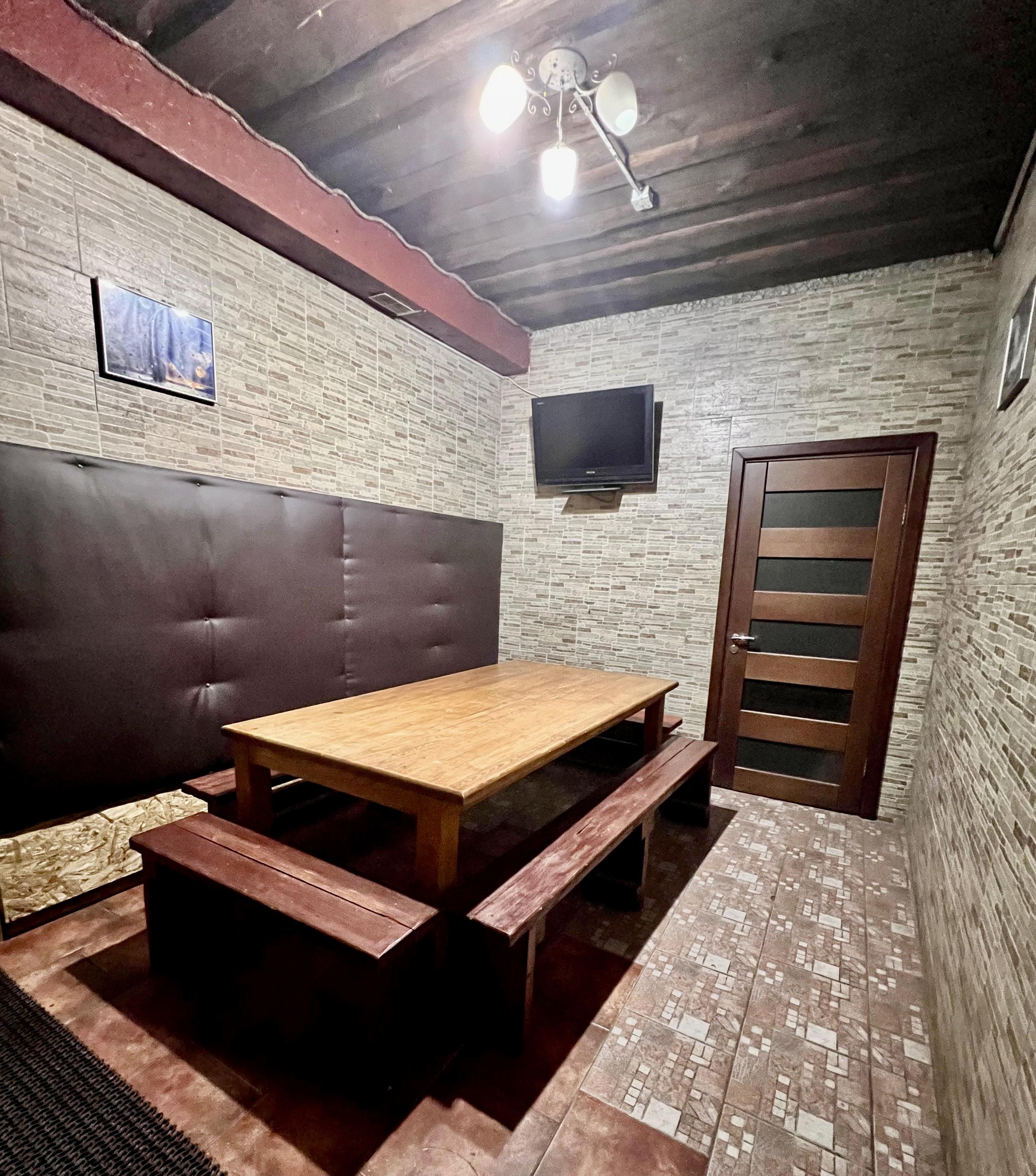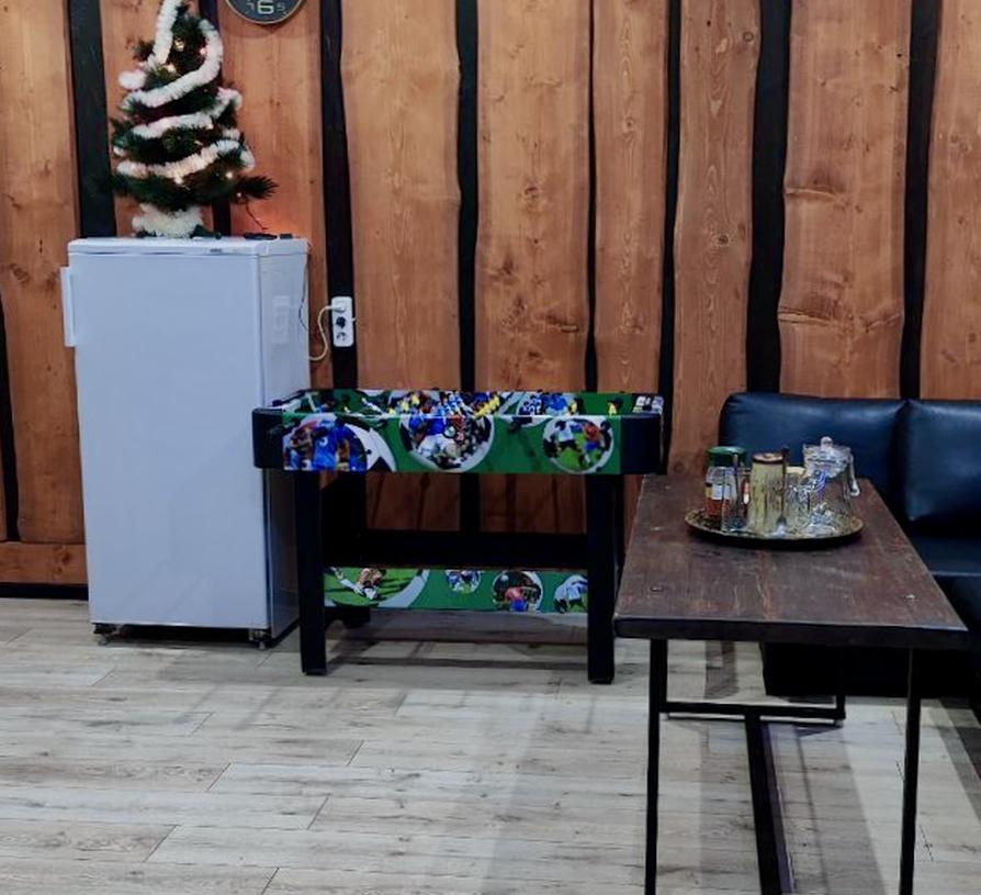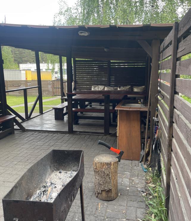 Прилегающая территория: Просторная беседка с мангалом, освещением, розетками и умывальником. Территория облагорожена, имеется дровница и навес для инвентаря. Гостям также доступен настольный футбол, караоке, музыкальное оборудование.
