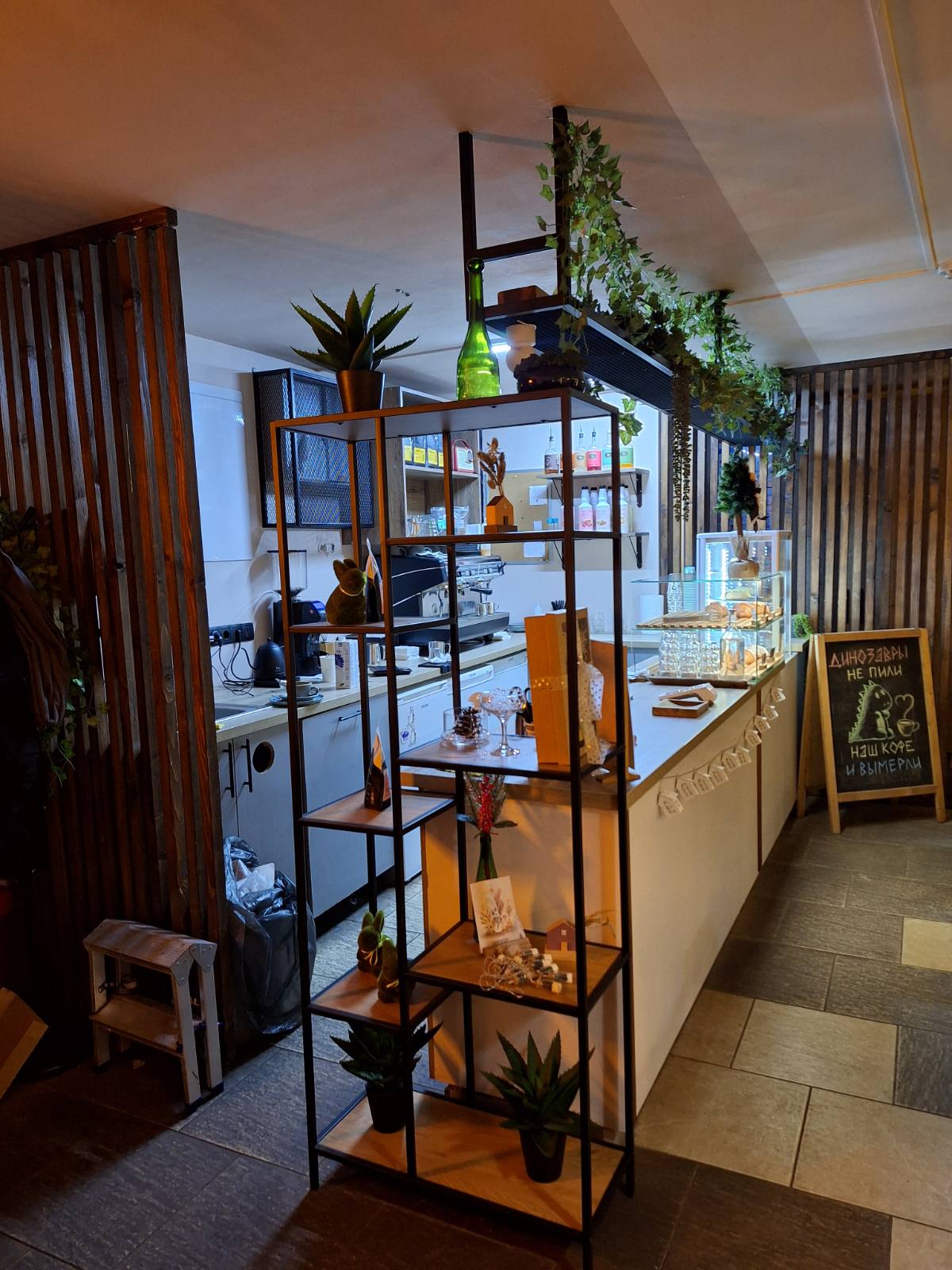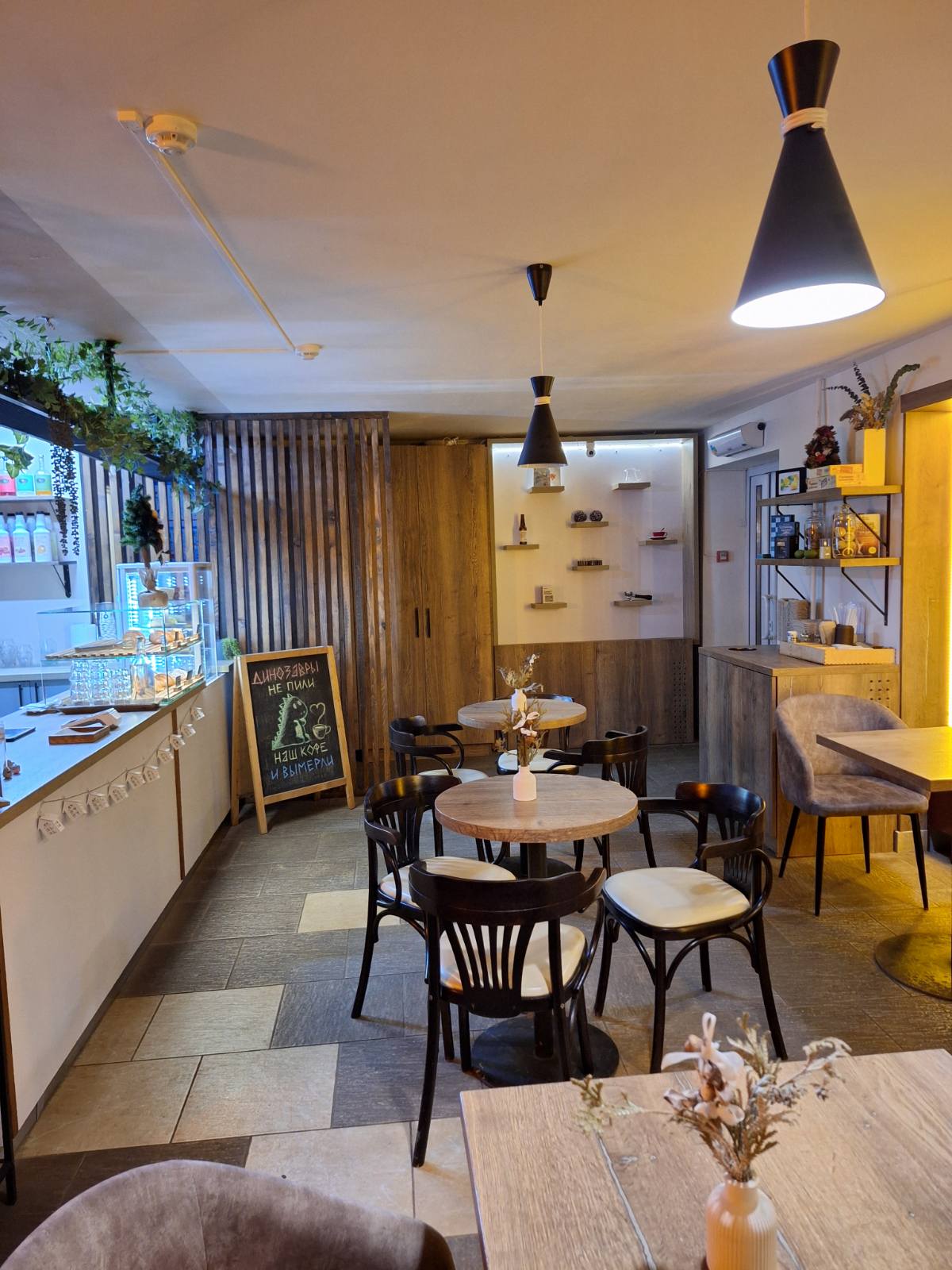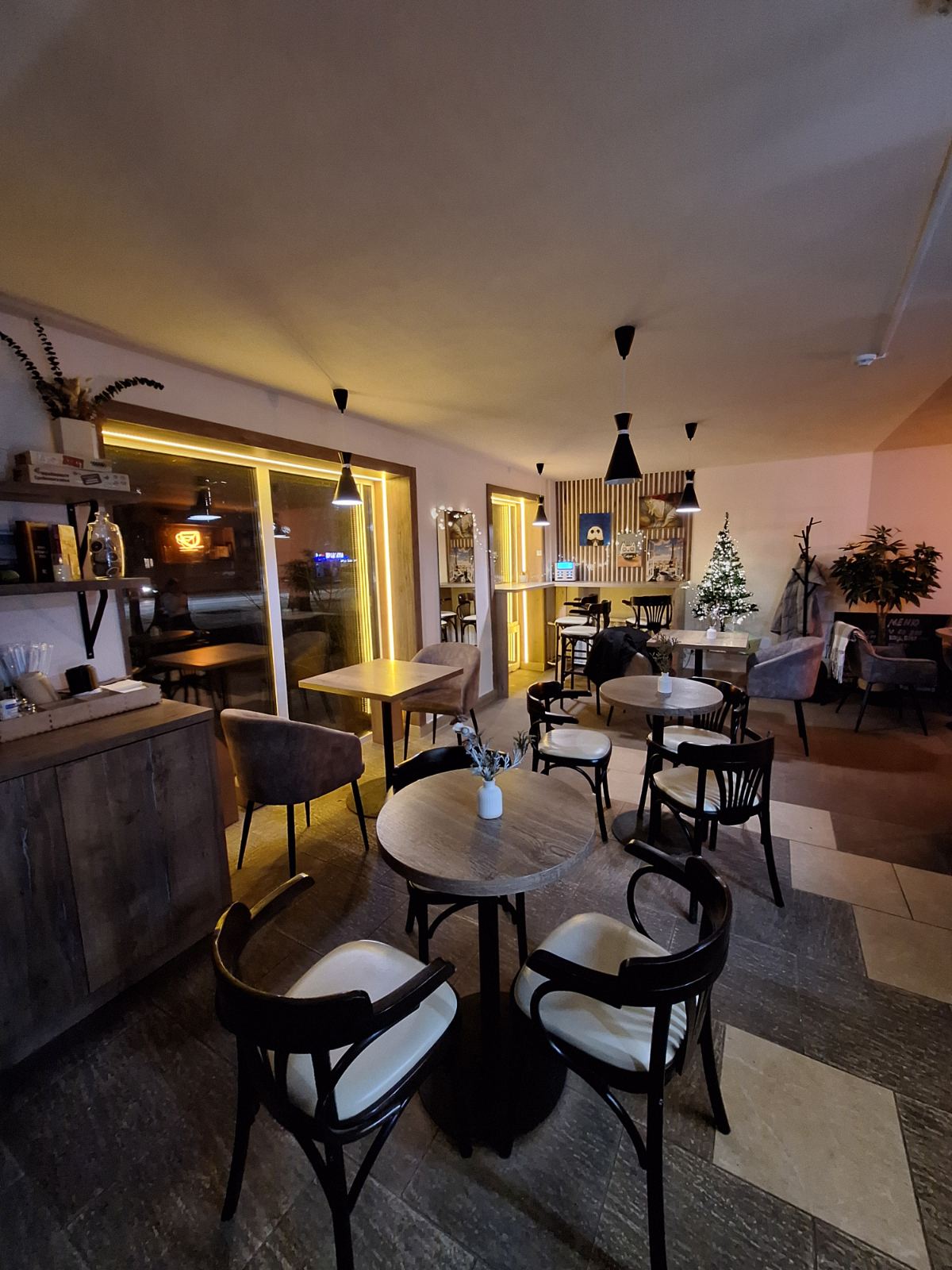 • Мебель и инфраструктура: Барная стойка, деревянная кухонная линия, стеклянная витрина, деревянные шкафы и стеллажи, разноформатные столы (4 ед.), мягкие диваны и стулья.
